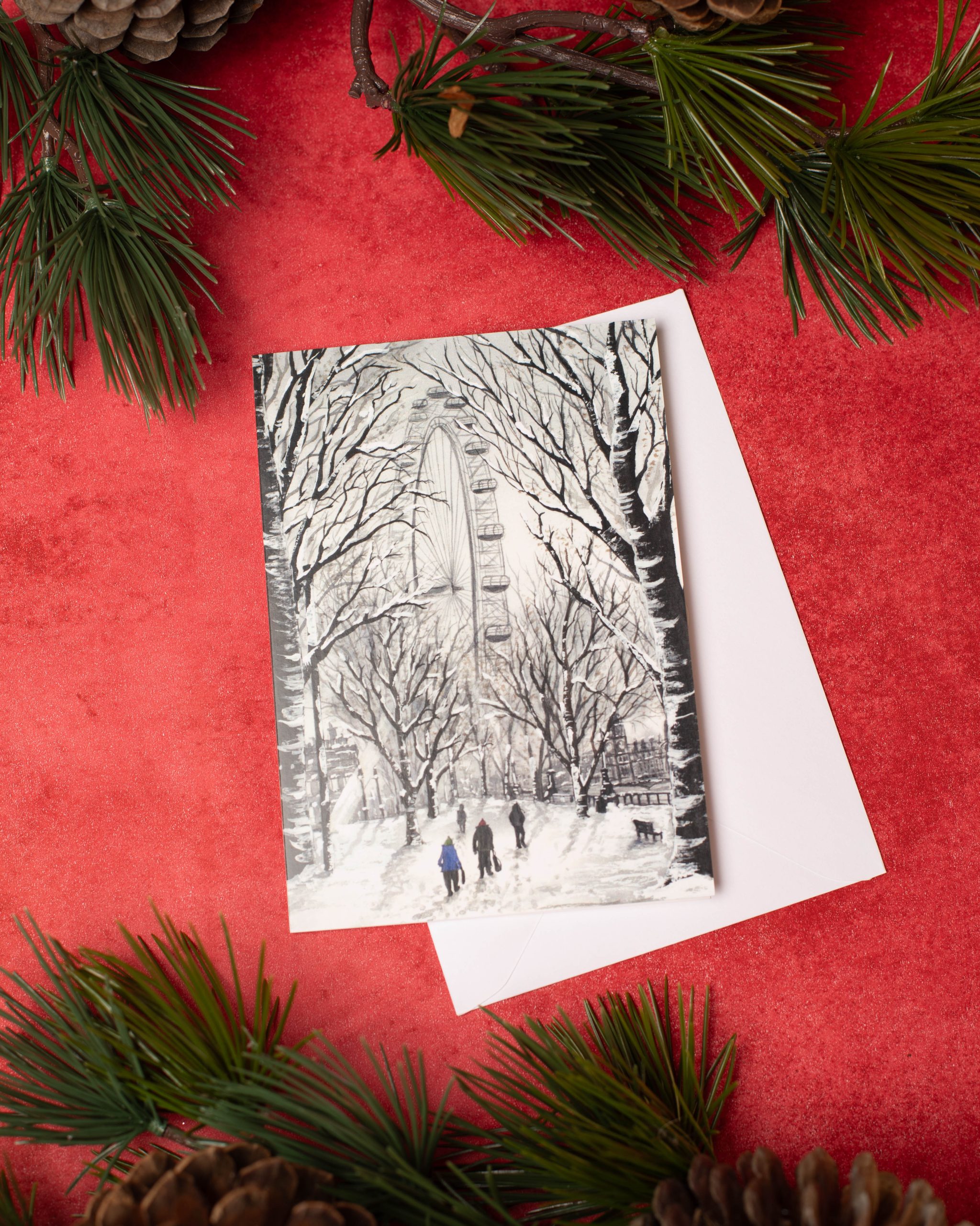 “Chilled London’s Eye” is a limited-run Christmas card reproduced from an original artwork by Boo. Printed in A6 format and supplied with a plain envelope. Inside message: “Merry Christmas”. A thoughtful way to share seasonal greetings.