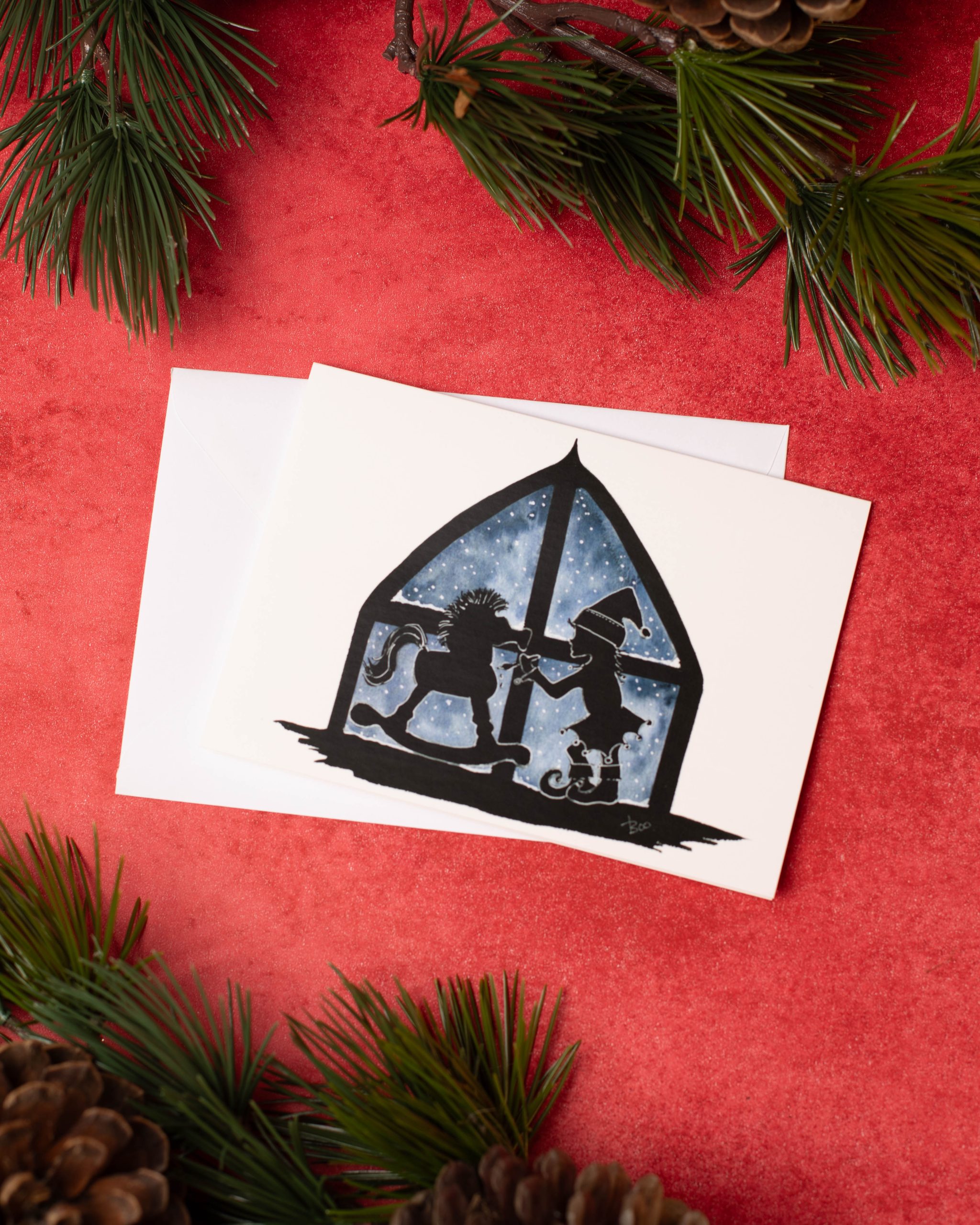 “Elf’s Workshop” is a limited-run Christmas card reproduced from an original artwork by Boo. Printed in A6 format and supplied with a plain envelope. Inside message: “Merry Christmas”. A thoughtful way to share seasonal greetings.