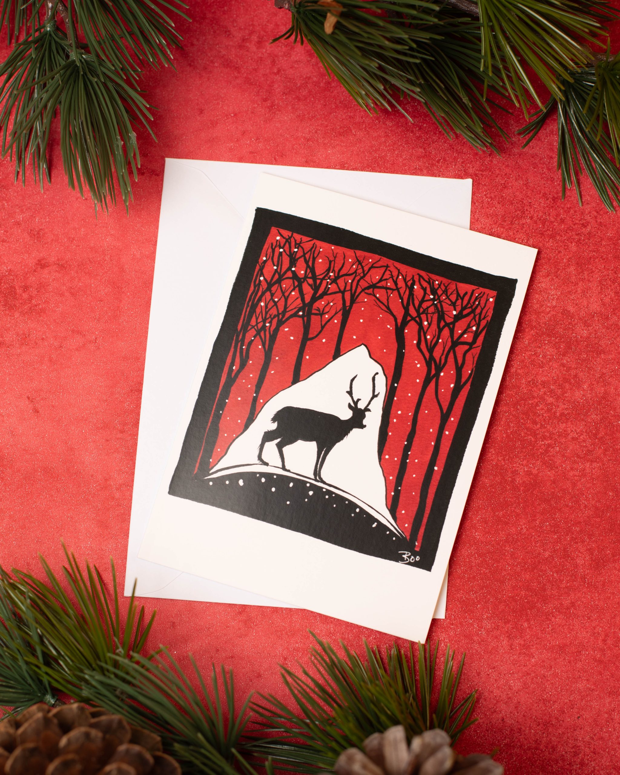 “Rudolph’s Woodland Wander” is a limited-run Christmas card reproduced from an original artwork by Boo. Printed in A6 format and supplied with a plain envelope. Inside message: “Merry Christmas”. A thoughtful way to share seasonal greetings.
