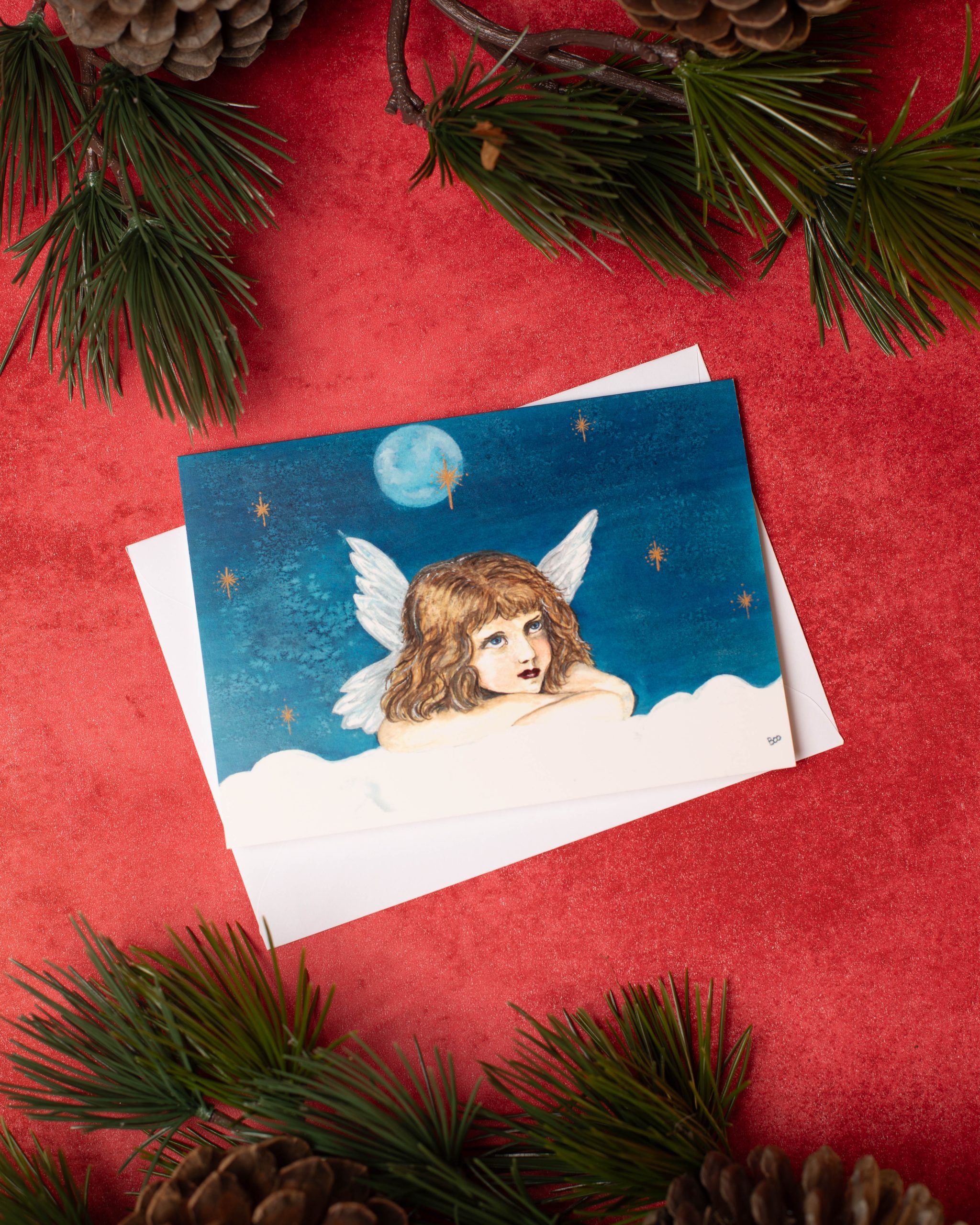 “Stargazing” is a limited-run Christmas card reproduced from an original artwork by Boo. Printed in A6 format and supplied with a plain envelope. Inside message: “Merry Christmas”. A thoughtful way to share seasonal greetings.